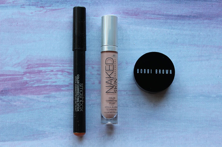 I have tried 3 different colour correcting products; Smashbox Colour Correcting Stick in Orange, Urban Decay Naked Skin Colour Correcting Fluid in Peach and Bobbie Brown Corrector in Light Peach (left to right). As you can probably see in the swatches the Bobbie Brown concealer is too light for me and that is because I actually purchased it for my mum, who has a lighter skin tone than I do. I like the peach corrector, as it is very light yet my favourite is the orange corrector.